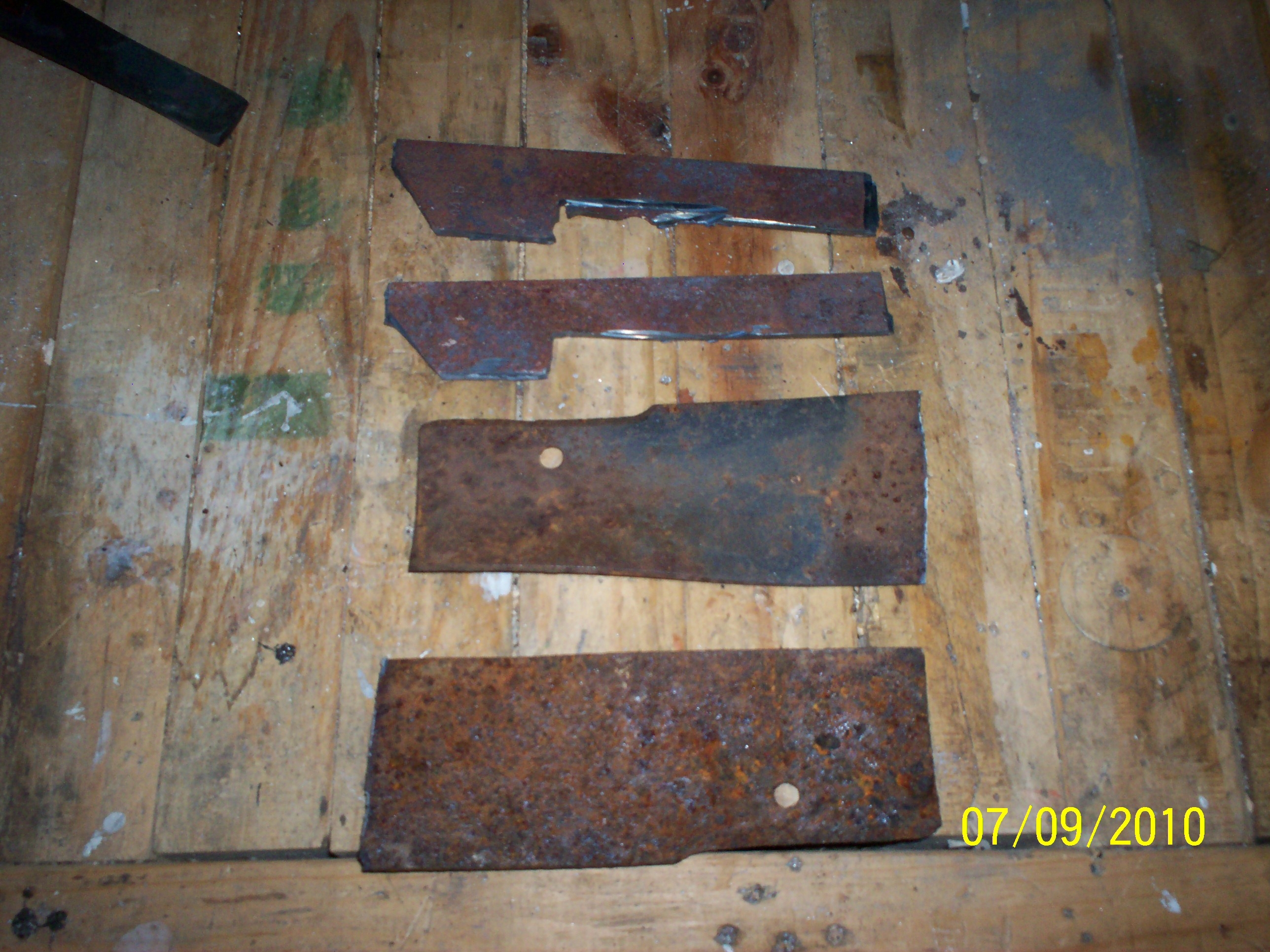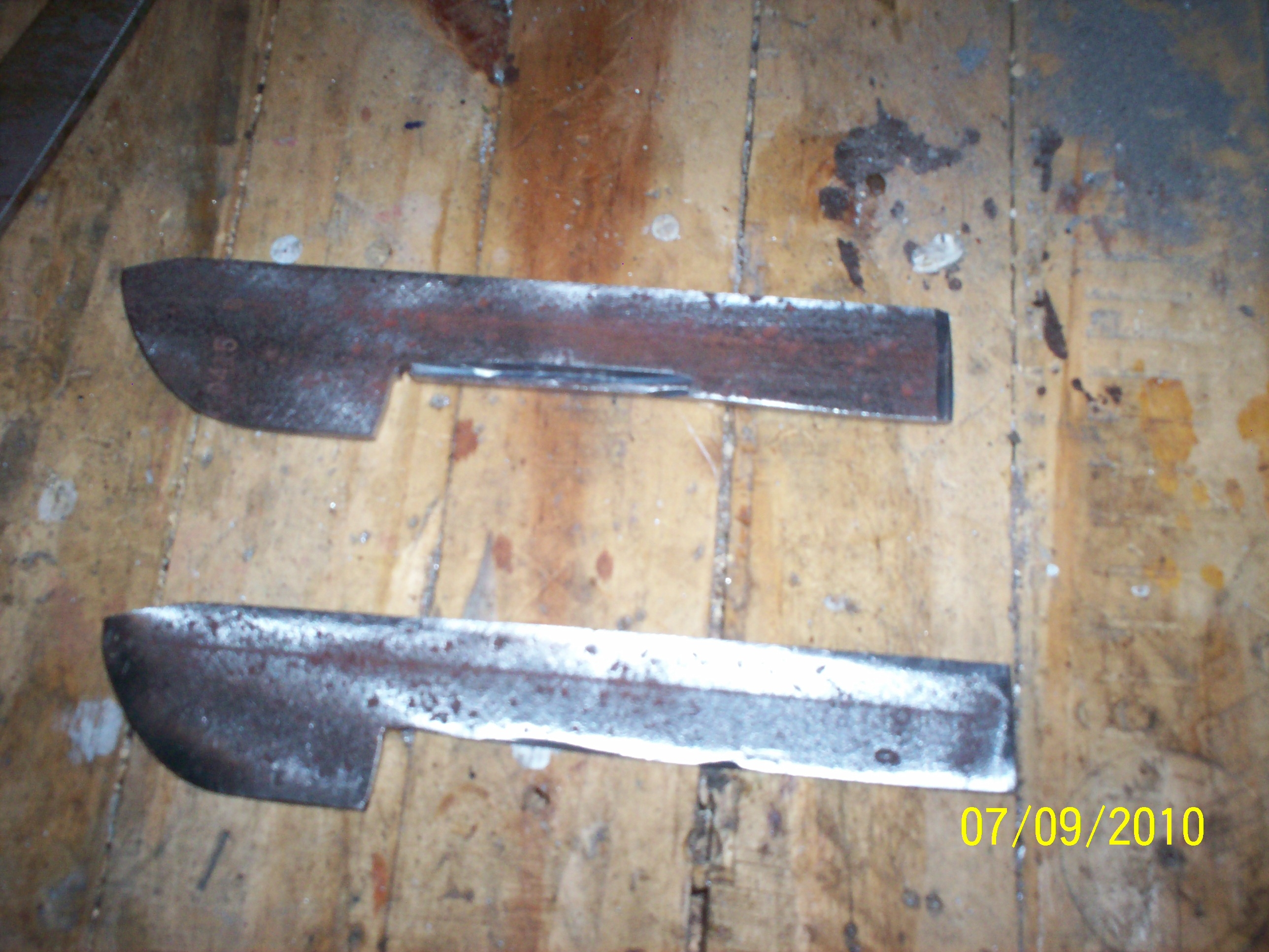 Here are a couple of skinning/utility knives I’m almost done with. You can see how it came from a rusty lawn mower blade and needed some work. I’m using some cherry wood for the handle and it cleans up nicely with the boiled linseed oil and the buffing wheel. The last picture shows one complete (with my new brand logo burnt into it) and what the “almost finished” product looks like. After a lot of rough and fine sanding, the boiled linseed oil, buffer and logo, it’ll look just like the top one.