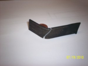 The second picture shows a whole piece of steel that was heat treated, but then “normalized” in an oven at 400 degrees for two hours. The metal turned a straw color which indicates it will retain a 58 Rockwell hardness or so. Once bent in the vise w/ the crescent wrench, it went about 45 degrees before it snapped.