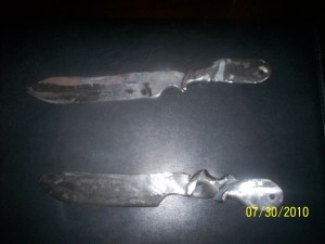 Here are the two knives that I twisted the handles on for some rustic metal knives. I’ve done some grinding and the edge is looking good on the bottom one. I did a lot of hammering on the bottom one at the cabin to thin the edge out so the grinding went pretty quickly on that one. The top one is still about 5/32″ thick, so I have a bunch of grinding to do to get that up to snuff.