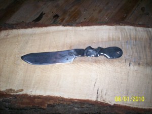 I used the vise and anvil to twist the unique handle and did some pounding on the blade to create the bevel as to reduce the amount of stock removal. Forging a knife is supposed to produce a more quality blade, so this may have made a better blade as well. All in all, it’s different and I am very pleased with the rustic look.