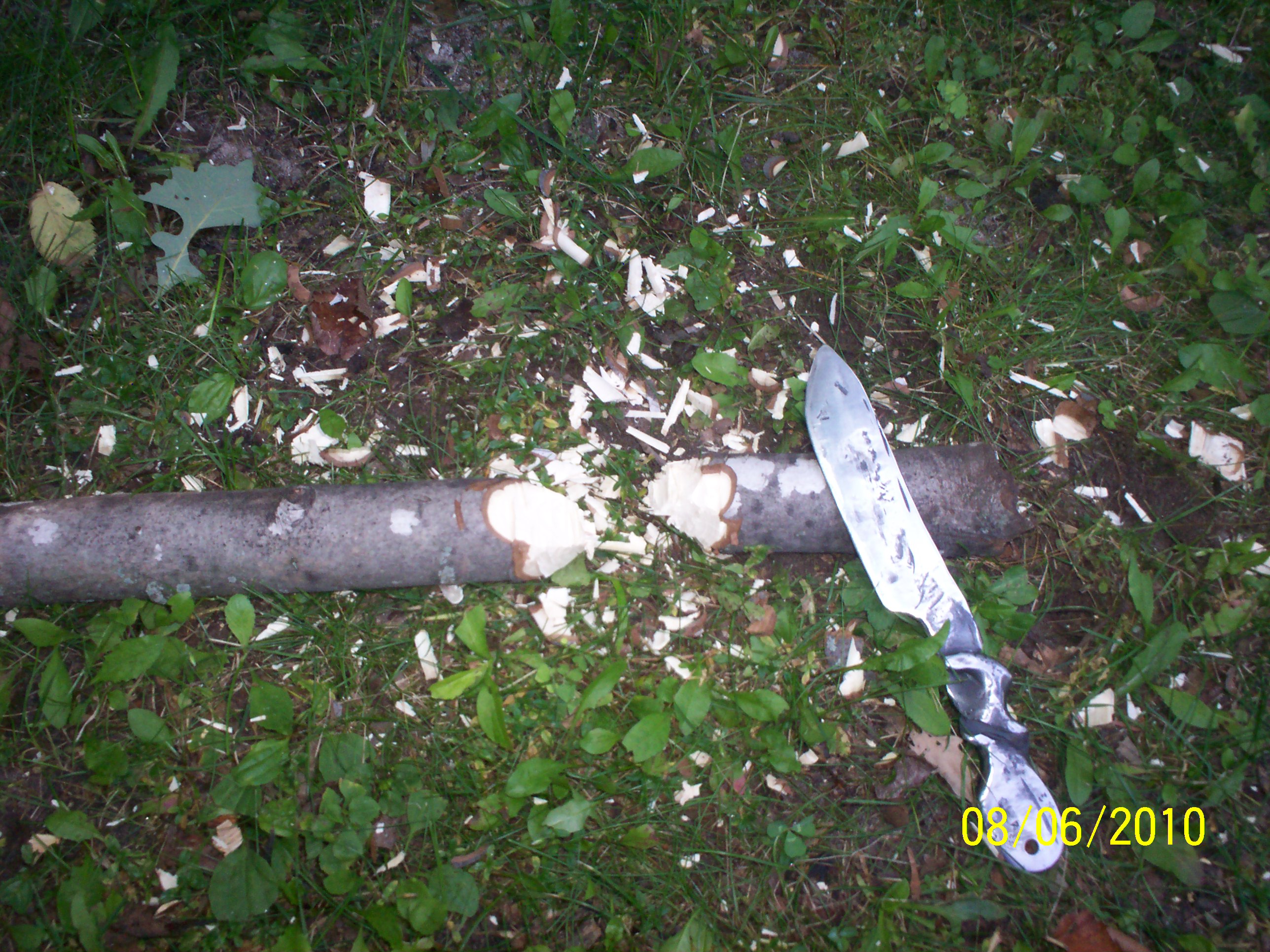 I remembered that a branch fell off our silver maple tree a while back. This piece measured 1-3/4″ thick, but was completely solid. The oak had some soft bark and such, but this was nothing but hard maple (maple is one of the hardest woods I can think of). This took some real effort, but it made it through with flying colors. No dull edge that I can find and it still slices paper without any additional sharpening. Incredible.