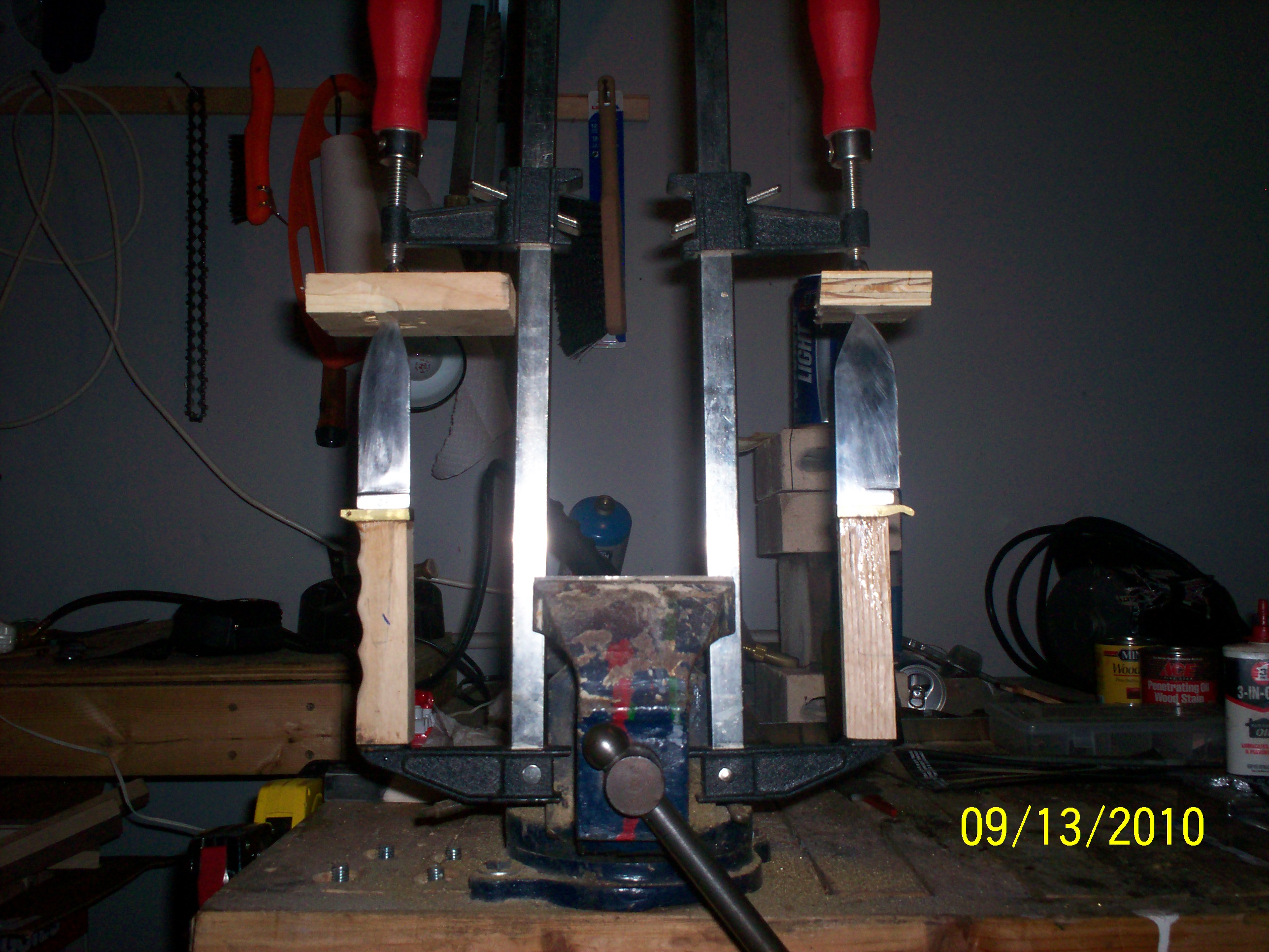 Glue up Posted byjasonpromSeptember 13, 2010Posted inKnife Making Here are a couple knives that are epoxied and drying Related