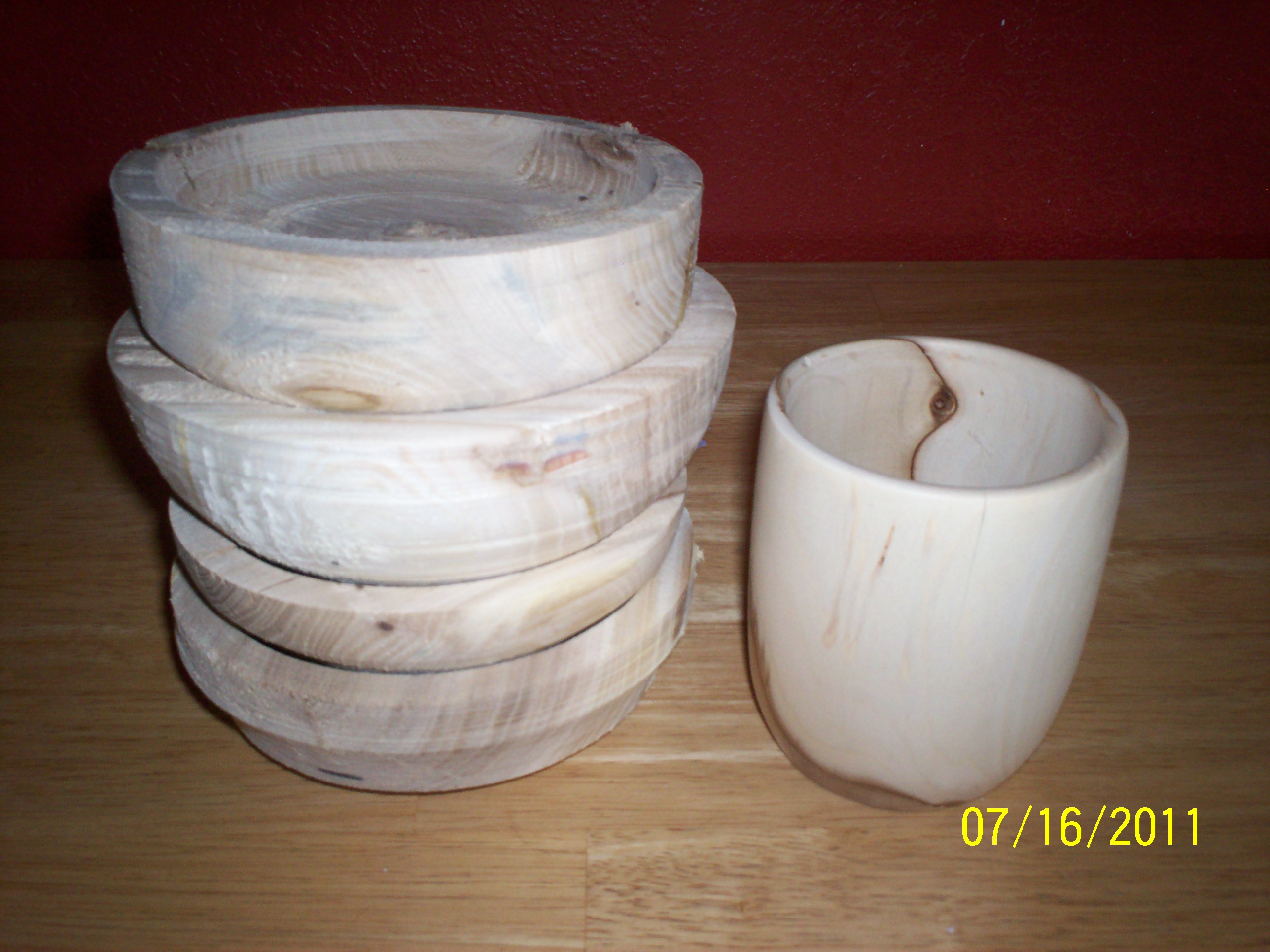 I have been learning about and trying two different wood bowl turning techniques. The bowls on the left are elm and are being made using the first technique I've learned. First, I "rough out" the bowl. This means means that I get it to about the shape that I would like the bowl to be when it is done. These bowls have been turned from log halves when cut with the grain (grain runs left to right on these bowls). Once it is roughed out, I put them in a paper bag and let them dry over the course of a couple months or more. If I was to just put them in the house to dry without placing them in a bag, they will start to crack as they dry (I read about this after I had a couple bowls crack on me!). Wood moves; so I do expect them to warp while they dry, but this will be addressed when I do the final turning. Every so often I weigh each bowl with a digital kitchen scale and keep track of the weight loss. When I notice that it has quit loosing weight or is loosing such an insignificant amount, I am ready to do the finish turning. I've had good luck using this way of drying the wood. In theory, it will only loose weight when you either remove wood or water has left the wood. I haven't touched the bowl to a chisel, so it must be the water leaving. Once it is dry, I re-chuck the bowl, do the finish turning, sanding and finishing. The bowl or vase on the right was turned using a newer technique I have been learning about. This is an end grain turning (grain runs up and down on the bowl) made from a silver maple branch I cut off a tree in my yard about 2 weeks prior to turning this project. The idea here is to turn the project from "green" (wet, right off of the tree) wood. Using this technique, if you turn the walls of the bowl to 1/4" or less, you shouldn't have any cracking. Basically you turn this thing green, sand it and finish it when done and be done with it! I find it rather hard to get a good finish when sanding it right after I turn it because it is still wet. So, I have been letting them dry for a day or so before remounting and sanding the project. I've only done three projects this way so far and have had very good success. I've had a few small cracks and checks but this was my fault as the areas that have cracked have been thicker than 1/4"; ironically, the rest of the bowl which had no cracks or checks. When using this second technique, you also should be open to the possibility of the wood moving (warping or curving) as it drys and accept that as dried shape as part of the beauty of the piece. I like the perfection of the first method, but I also like the speed and freedom on the second method. Happy turning!