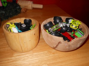 Not every project turns out as planned. Here are two examples of bowls I started to turn that turned out to be more work than it was worth. Both of these had developed cracks and the bowls flew off the lathe multiple times. At some point you have to say when on these projects. There is plenty of wood to be turned on my wood pile. My kids found these in my burn pile and asked if they could have them. What could I say? So, they are now Matchbox car storage devices.
