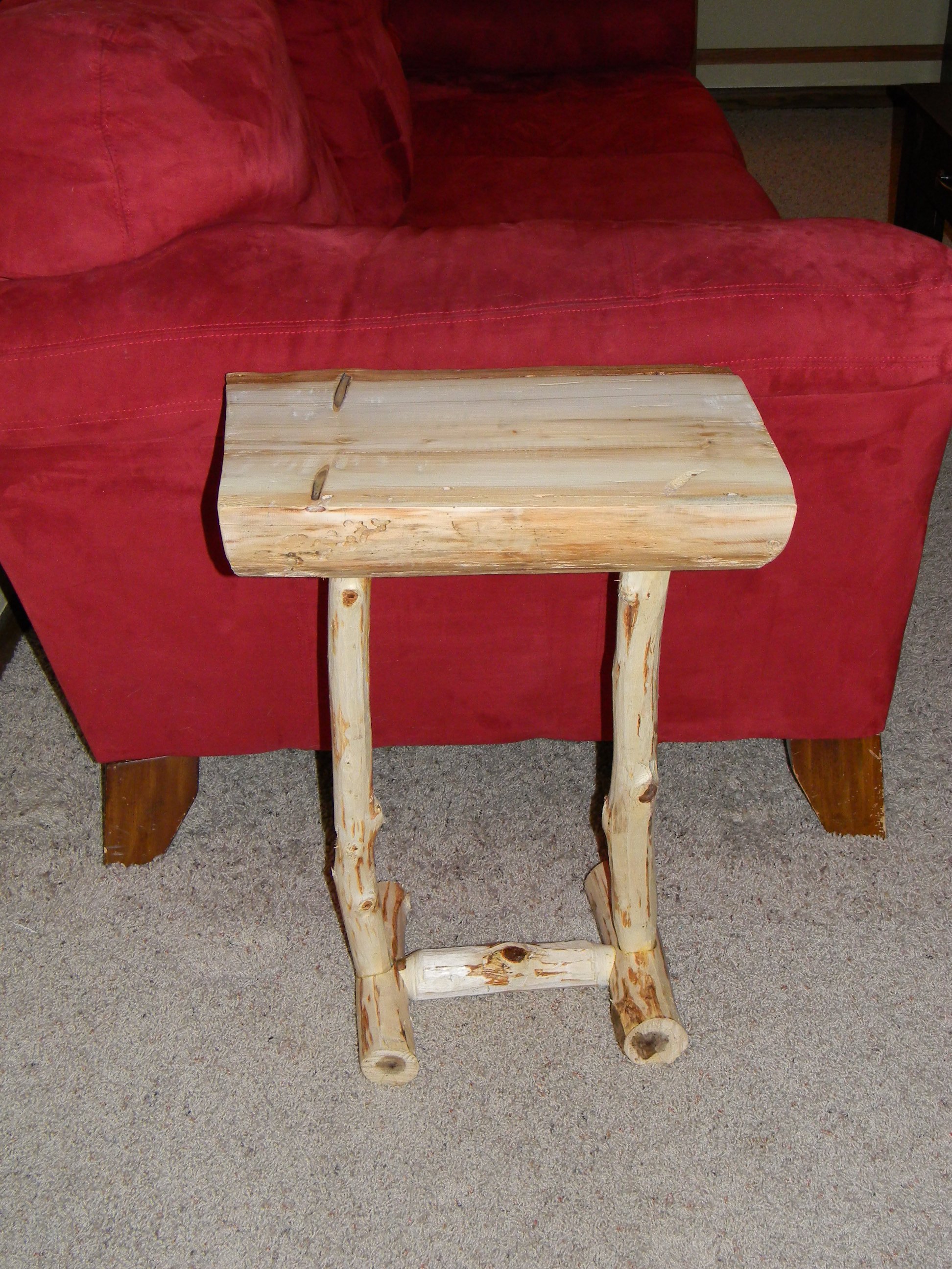 I've wanted to make some log furniture for a long time. I finally got the draw knife out and made some shavings. It isn't pretty, but it should work as an end table at the cabin. If I had to do it over again, I would find a better log for the top, use larger logs for the legs and feet and make all of the tenons on my lathe instead of with the hatchet and draw knife. You have to start somewhere!